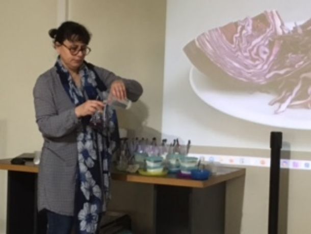 Ensuite, nous nous sommes installés et elle nous a fait frotter du chou rouge sur un sopalin, ce qui a laissé des traces violettes.