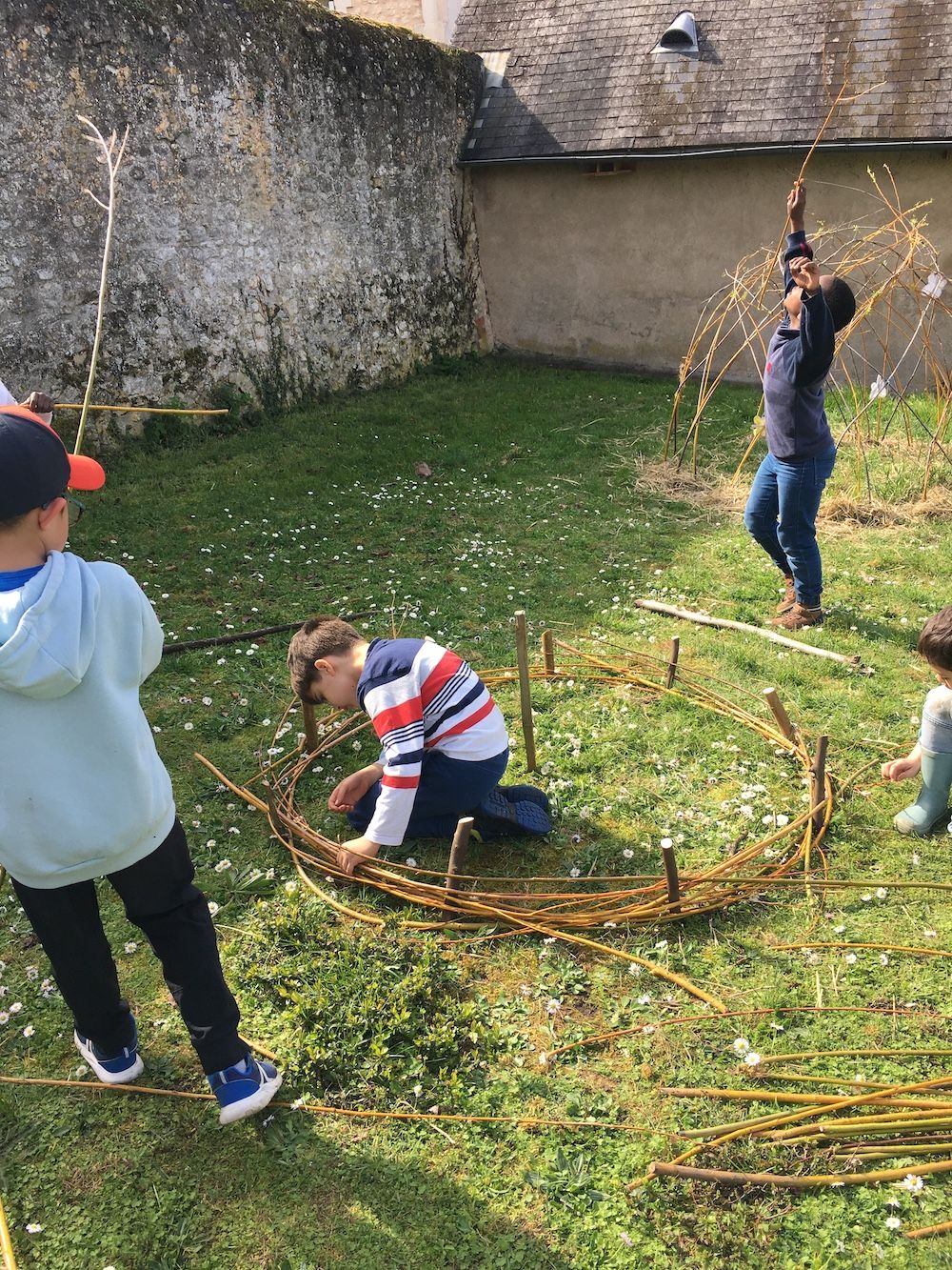 Les CP-CE1 ont planté des légumes, aménager des espaces pour des futures plantations en construisant des barrières en osier et en noisetier, des tuteurs en forme de tipis avec des bambous et ils ont préparé des semis pour les plantations à venir des élèves de GS.